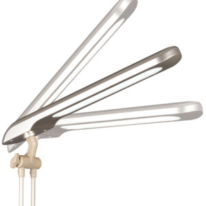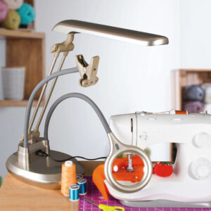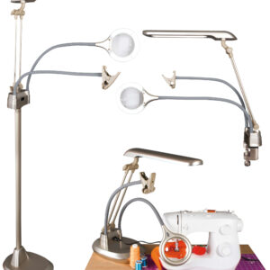 The most versatile and feature-packed lamp OttLite has ever developed, the OttLite Ultimate 3-in-1 Creative Station is a game changer for craft and sewing rooms alike. This lamp easily transforms from a floor lamp, to a table lamp, to a sturdy clamp-on lamp, so you can adapt it to your changing needs. Magnify the details with the 2x optical-grade magnifier that’s surrounded by 360 degrees of crisp, clear LED illumination. Both the magnifier and sturdy hands-free clip placed on long, flexible 20 ¾” arms so you can put them exactly where needed. There’s even a convenient outlet included to fully charge smartphones, tablets or power those craft tools. The long 18 inch x 3.5 inch shade features OttLite’s exclusive ClearSun LED technology – shown to reduce eyestrain and glare for hours of working in comfort. This high contrast, dimmable light has a color rendering index (CRI) of 95+ so you’ll see every color accurately and detail clearly.