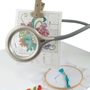 The most versatile and feature-packed lamp OttLite has ever developed, the OttLite Ultimate 3-in-1 Creative Station is a game changer for craft and sewing rooms alike. This lamp easily transforms from a floor lamp, to a table lamp, to a sturdy clamp-on lamp, so you can adapt it to your changing needs. Magnify the details with the 2x optical-grade magnifier that’s surrounded by 360 degrees of crisp, clear LED illumination. Both the magnifier and sturdy hands-free clip placed on long, flexible 20 ¾” arms so you can put them exactly where needed. There’s even a convenient outlet included to fully charge smartphones, tablets or power those craft tools. The long 18 inch x 3.5 inch shade features OttLite’s exclusive ClearSun LED technology – shown to reduce eyestrain and glare for hours of working in comfort. This high contrast, dimmable light has a color rendering index (CRI) of 95+ so you’ll see every color accurately and detail clearly.
