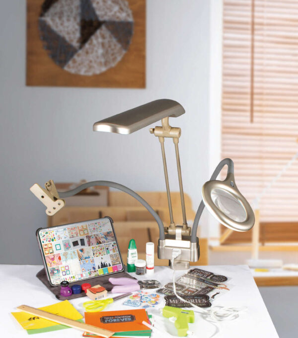 The most versatile and feature-packed lamp OttLite has ever developed, the OttLite Ultimate 3-in-1 Creative Station is a game changer for craft and sewing rooms alike. This lamp easily transforms from a floor lamp, to a table lamp, to a sturdy clamp-on lamp, so you can adapt it to your changing needs. Magnify the details with the 2x optical-grade magnifier that’s surrounded by 360 degrees of crisp, clear LED illumination. Both the magnifier and sturdy hands-free clip placed on long, flexible 20 ¾” arms so you can put them exactly where needed. There’s even a convenient outlet included to fully charge smartphones, tablets or power those craft tools. The long 18 inch x 3.5 inch shade features OttLite’s exclusive ClearSun LED technology – shown to reduce eyestrain and glare for hours of working in comfort. This high contrast, dimmable light has a color rendering index (CRI) of 95+ so you’ll see every color accurately and detail clearly.