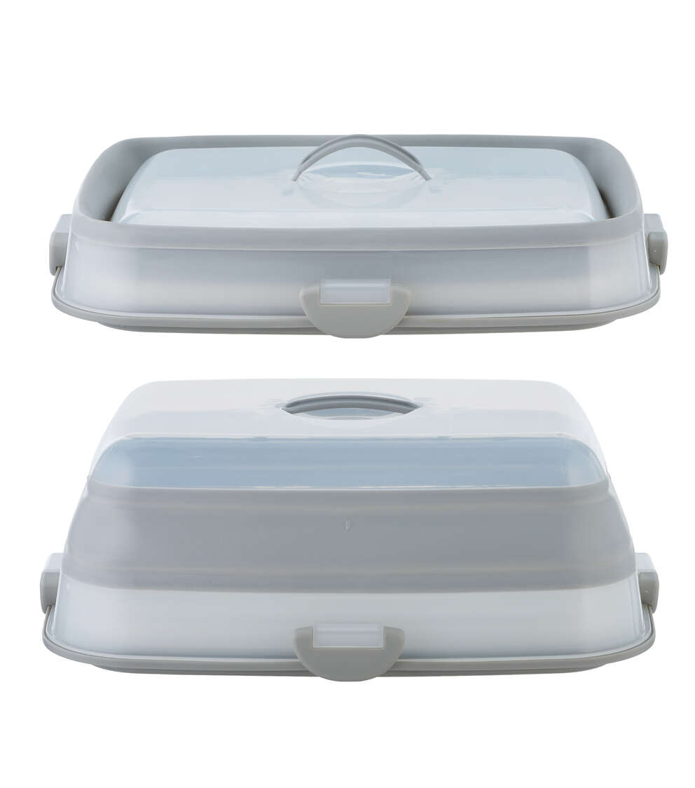 Transport cakes, appetizers & more with this versatile carrier. The flat side of insert is perfect for transporting a 9 by 13 sheet cake and features a built in slicing guide. COLLAPSIBLE and DURABLE. This dishwasher safe carrier includes 2 trays: a reversable divided appetizer or cake tray and a deviled egg tray. Tray nests inside carrier lid which collapses to half its original height. Collapse to store, expand to use.