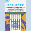 Use the Schmetz Machine Embroidery Needles – Gold to create lovely embroidery on apparel or home decor items. This pack includes five embroidery needles designed with enlarged eyes that are ideal for all your special application threads. Simply fix a needle on your embroidery machine and enjoy designing with embroidery threads like polyester, cotton metallic and mercerized threads. These needles come with a titanium coating that helps resist adhesives, improve needle wear and offers smooth gliding through coarse and densely woven fabrics.