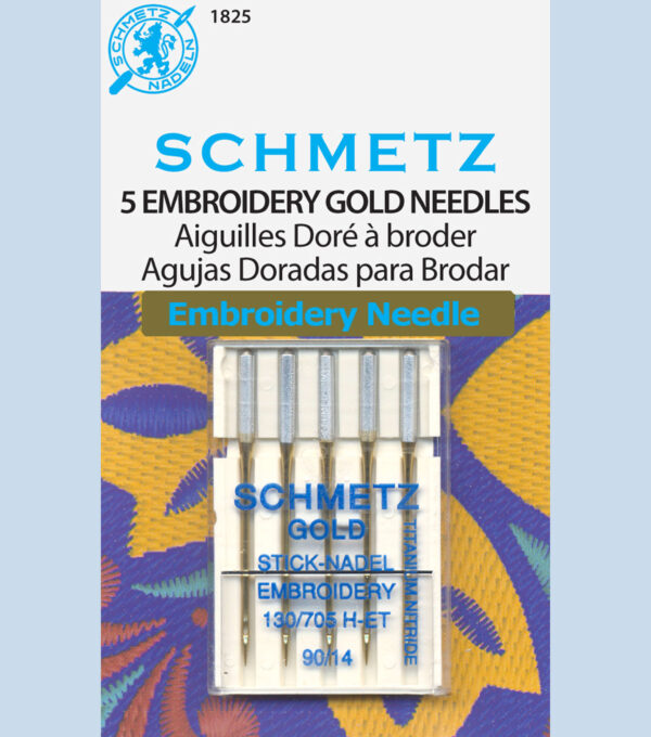 Use the Schmetz Machine Embroidery Needles – Gold to create lovely embroidery on apparel or home decor items. This pack includes five embroidery needles designed with enlarged eyes that are ideal for all your special application threads. Simply fix a needle on your embroidery machine and enjoy designing with embroidery threads like polyester, cotton metallic and mercerized threads. These needles come with a titanium coating that helps resist adhesives, improve needle wear and offers smooth gliding through coarse and densely woven fabrics.