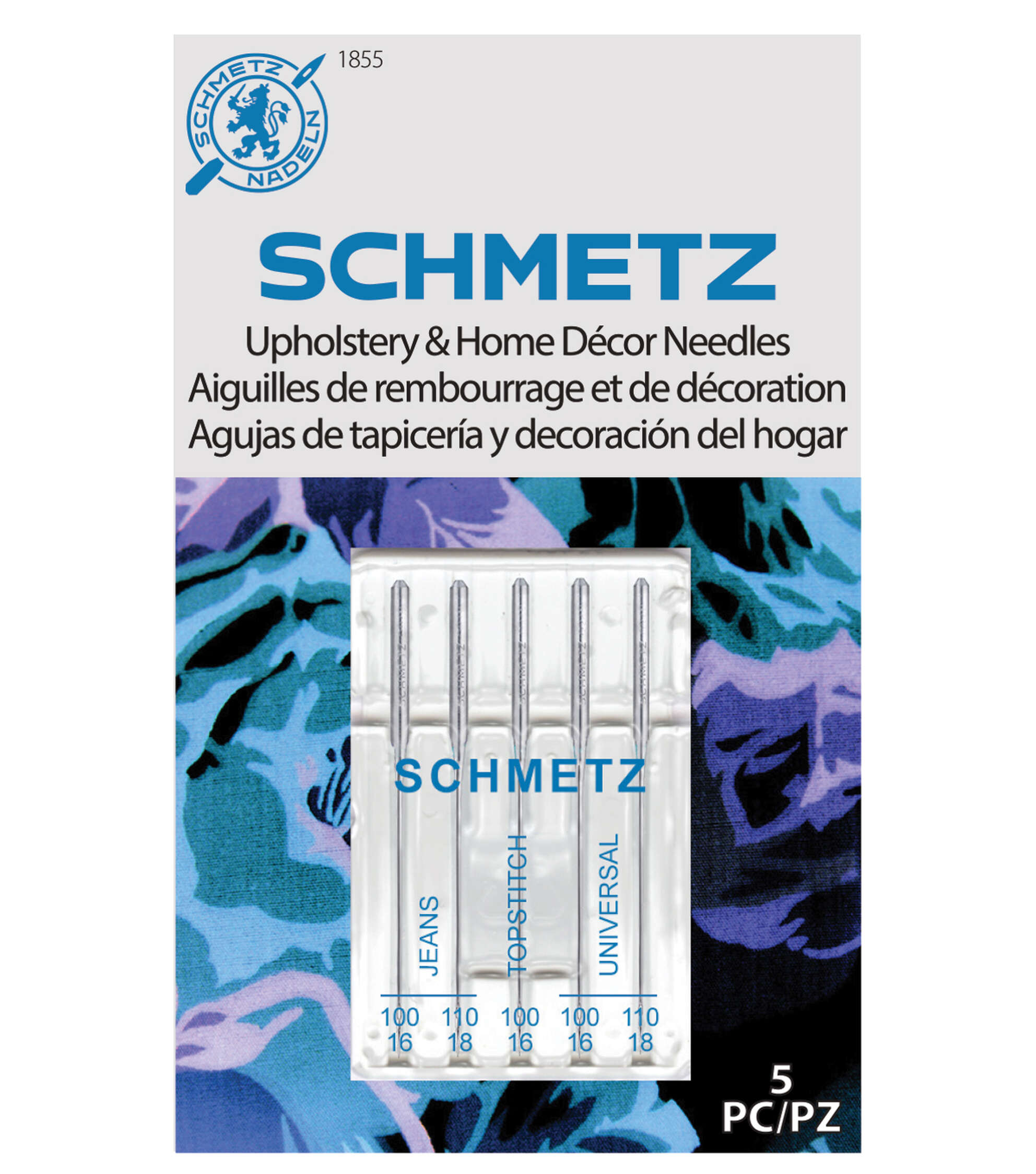 Get started on your next decor project with the Schmetz Upholstery & Home Decor Needles. This pack includes one each of denim needles and universal needles in sizes 100/16 and 110/18. These needles are just what you need while working on canvas, corduroy, damask, denim and other heavyweight fabrics. The reinforced blade on the denim needles helps reduce skipped stitches while the elongated eyes ensure lesser thread breakage.