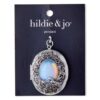Wear the hildie & jo Oval Locket Pendant-Silver to accessorize any outfit in style. The locket itself is a silver oval, with etchings on the sides and back. It’s accented with an oval in antique silver, and a smooth oval iridescent crystal in the center, surrounded by a scroll pattern. At the bottom, there is a bird on a branch that is slight set out from the iridescent crystal. The locket opens and closes, so you can add your favorite photos.
