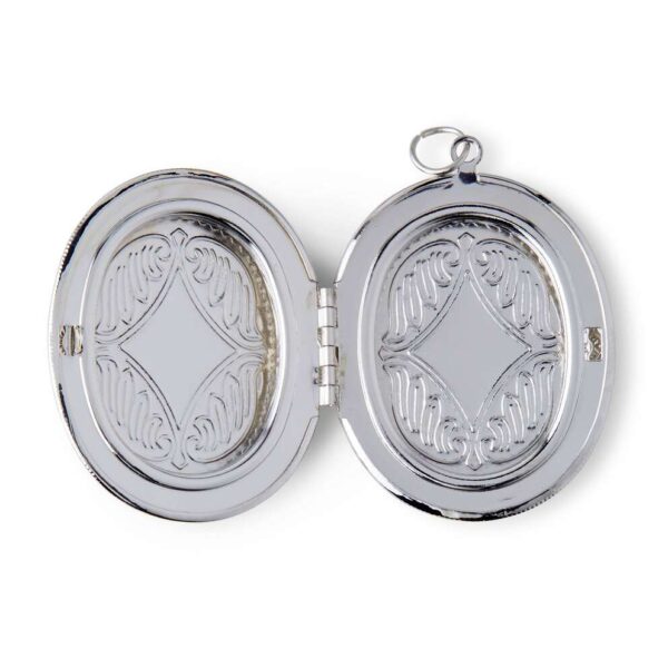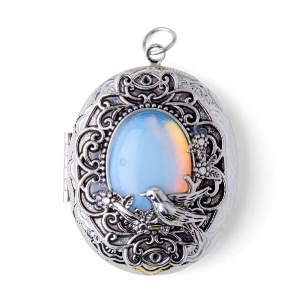 Wear the hildie & jo Oval Locket Pendant-Silver to accessorize any outfit in style. The locket itself is a silver oval, with etchings on the sides and back. It’s accented with an oval in antique silver, and a smooth oval iridescent crystal in the center, surrounded by a scroll pattern. At the bottom, there is a bird on a branch that is slight set out from the iridescent crystal. The locket opens and closes, so you can add your favorite photos.