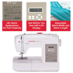 The SINGER 6180 Brilliance is full of features to get your sewing started faster, while adding a professional touch to your projects. With 180 stitch applications, you will have the right stitch for any fabric! Customize stitches to personalize projects using the adjustable stitch length and stitch width, viewable on the LCD screen. Enjoy Touch Button Stitch Selection, and watch the LED lighting. Sew buttonholes in one easy step with consistent results every time. There are 6 different styles of buttonholes to choose from – 2 styles of the basic bartack style for projects like dresses, shirts or home décor, 2 round end as well as 2 keyhole styles for menswear. Take off the Removable Storage Compartment to access the Free Arm, which makes it easy to sew trouser hems and cuffs or around difficult-to-reach areas like children’s clothing. Thanks to a built-in needle threader, you’ll be ready to start sewing in a breeze. Whether you’re just starting out or you’re a more experienced sewist, the SINGER 6180 Brilliance computerized sewing machine will be your go-to sewing tool to create and embellish fashions, home décor and much more!