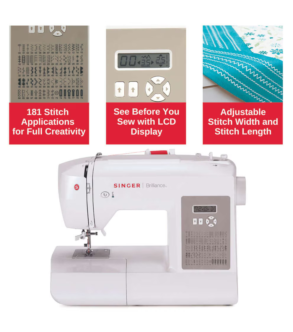 The SINGER® Brilliance™ 6180 sewing machine features 180 stitch applications. Choose from a great selection of essential, stretch and decorative stitches as well as six fully automatic one-step buttonhole styles. You’ll find the perfect stitch for any project.