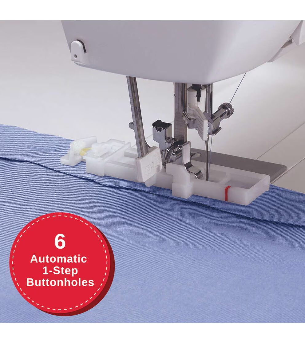 - Six Built-In One-Step Buttonhole Styles-Basic bartack, round end, and keyhole styles, with consistent results every time.