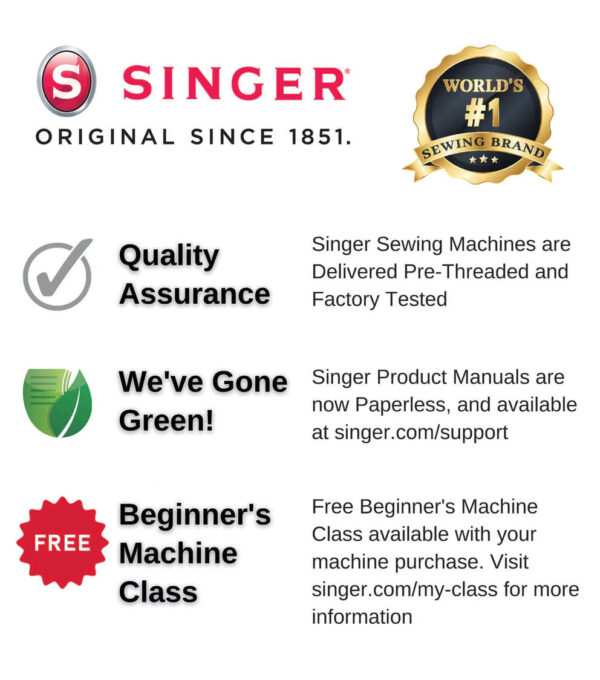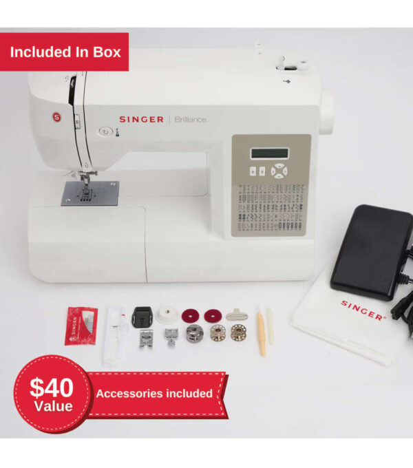 This SINGER® sewing machine comes with a variety of presser feet and accessories. Included Accessories: All-Purpose Foot, Zipper Foot, Buttonhole Foot, Package of Needles, Bobbins (Class 15, metal), Thread Spool Cap, Auxiliary Spool Pin, Spool Pin Felt, Darning Plate, Needle Plate Screwdriver, Seam Ripper with Lint Brush, Soft-Sided Dust Cover, Machine Intro DVD, and Instruction Manual