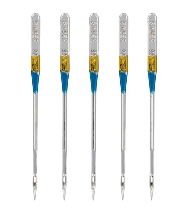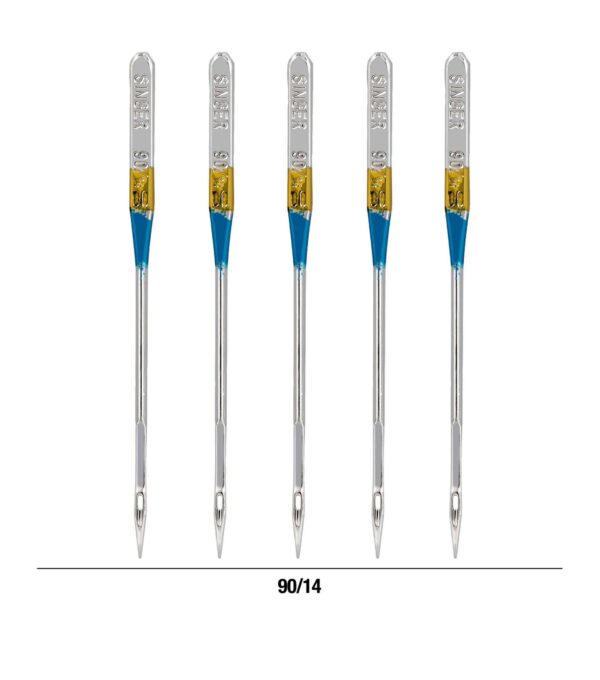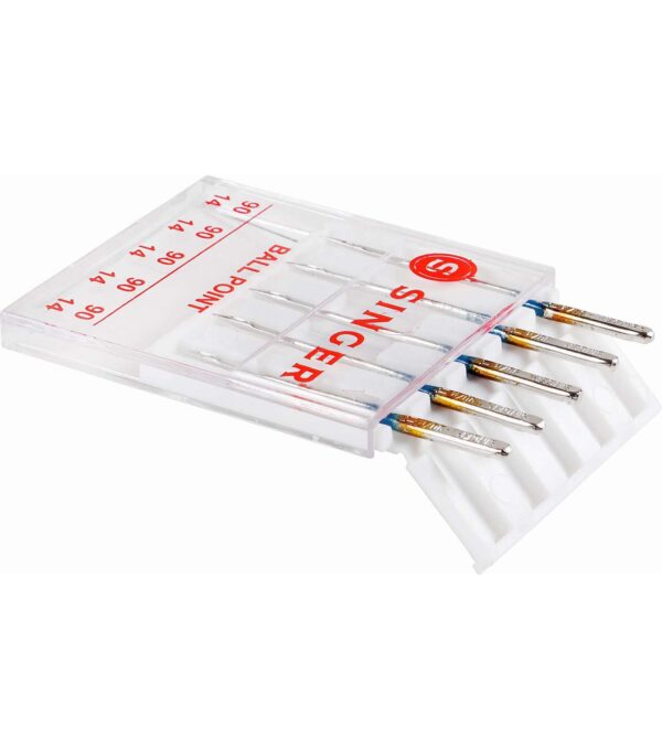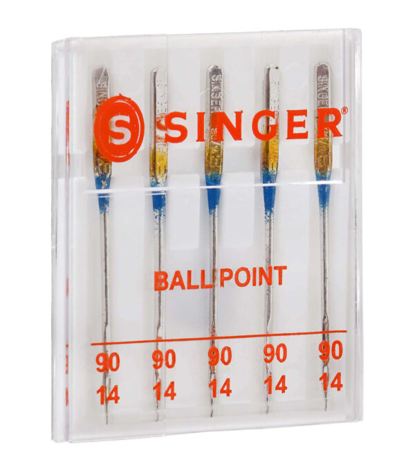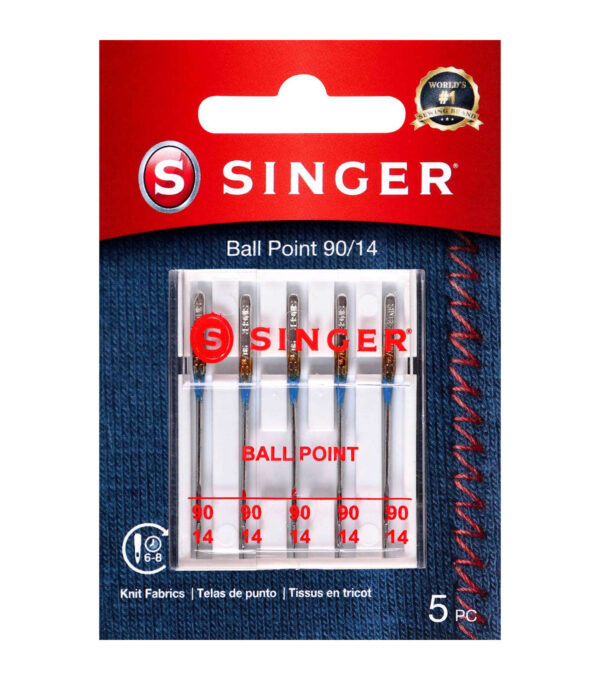 - This pack of 5 SINGER ball point sewing machine needles is the perfect addition to an existing collection of sewing machine needles. The point is designed to slide between fibers of knit fabrics smoothly, without creating holes or runs in knit fabrics. Needles are color coded and sized 90/14, best for use on medium-weight knit fabrics. The SINGER sewing machine needles can be used on SINGER, Brother, Kenmore, Bernina, Janome, Juki and other quality household domestic sewing machines. Domestic machines needles are not compatible with industry sewing machines.