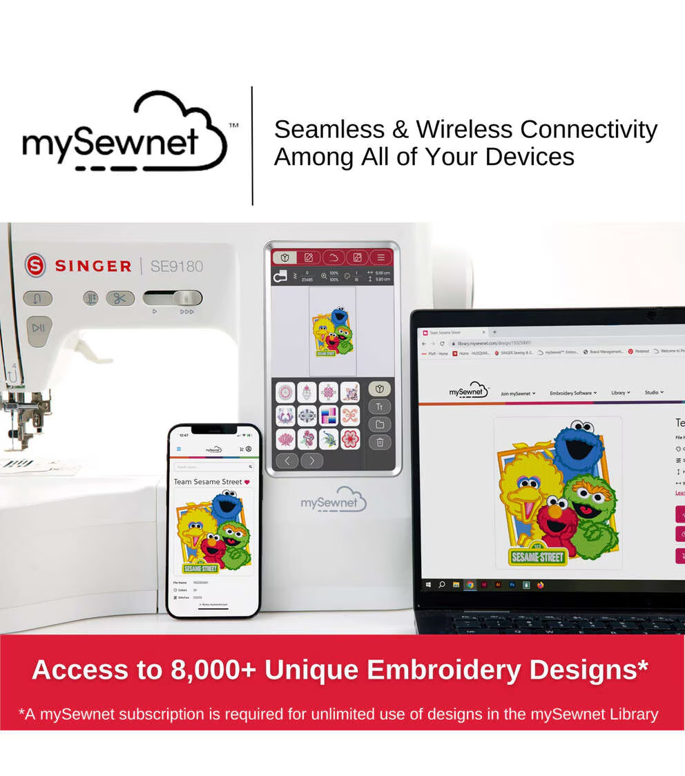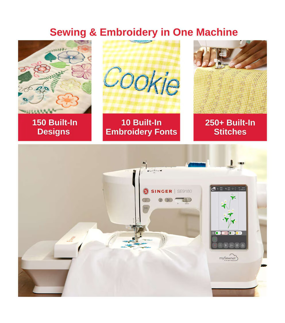 The SINGER SE9180 sewing and embroidery machine is loaded with user-friendly features that sewists of all levels love like a large 7″ touch screen so you can clearly see what you are stitching, and an automatic needle threader that will get you sewing in no time at all. Also, mySewnet connectivity gives you a whole world of possibilities from app notifications of your embroidery progress, to creating designs from scratch and so much more. Plus enjoy a 90-day free-trial of mySewnet software and the mySewnet Library, which has thousands of designs to choose from. With over 150 built-in embroidery designs and over 250 stitches, you get the best of both worlds with the Singer SE9180 sewing and embroidery machine.
