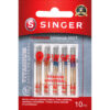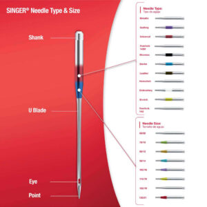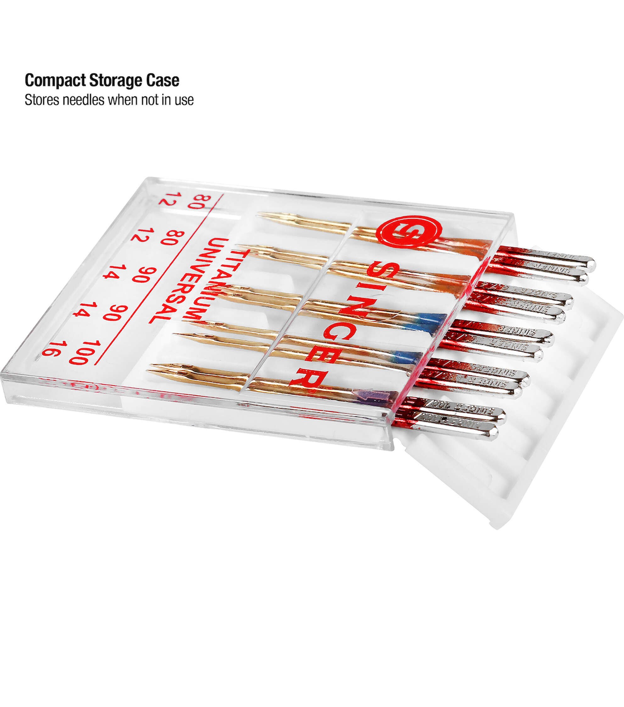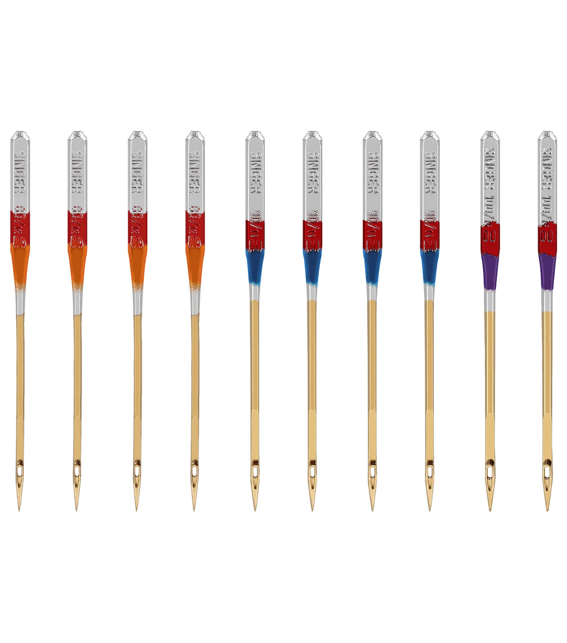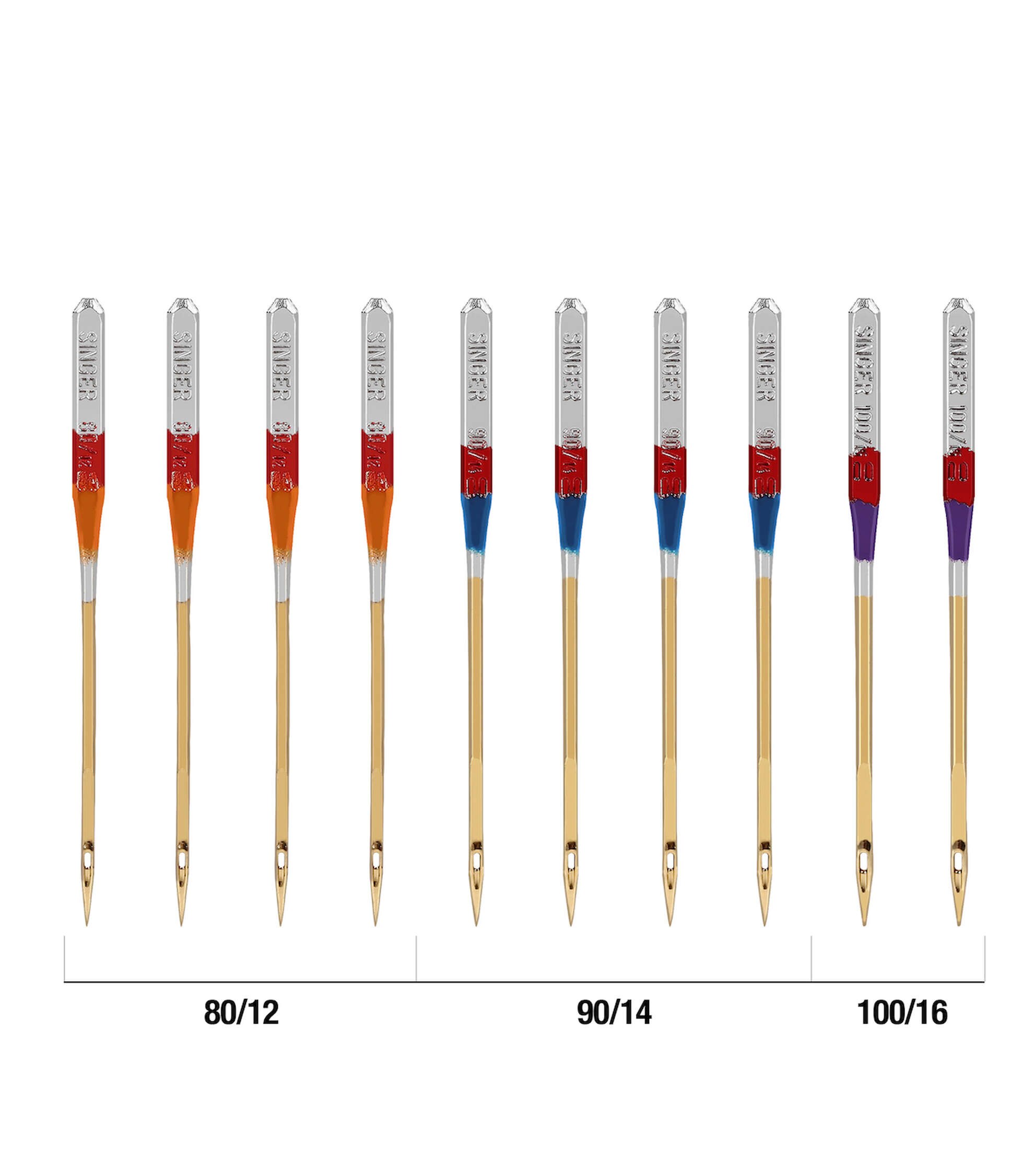 The Singer Titanium Universal Regular Point Machine Needles last four times longer than standard needles making them an excellent addition to any sewing enthusiast’s kit. This set includes four orange needles in size 80/11 for use on lightweight fabrics, four blue needles in size 90/14 for use on medium weight fabrics and two purple needles in size 100/16 for use on heavyweight fabrics. These needles are designed to fit Singer, Brother, Kenmore and other quality sewing machines.