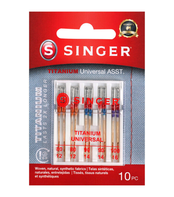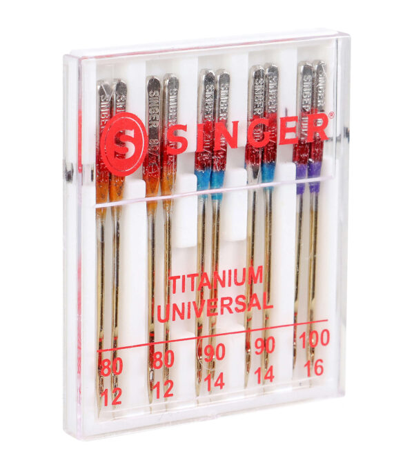 The Singer Titanium Universal Regular Point Machine Needles last four times longer than standard needles making them an excellent addition to any sewing enthusiast’s kit. This set includes four orange needles in size 80/11 for use on lightweight fabrics, four blue needles in size 90/14 for use on medium weight fabrics and two purple needles in size 100/16 for use on heavyweight fabrics. These needles are designed to fit Singer, Brother, Kenmore and other quality sewing machines.