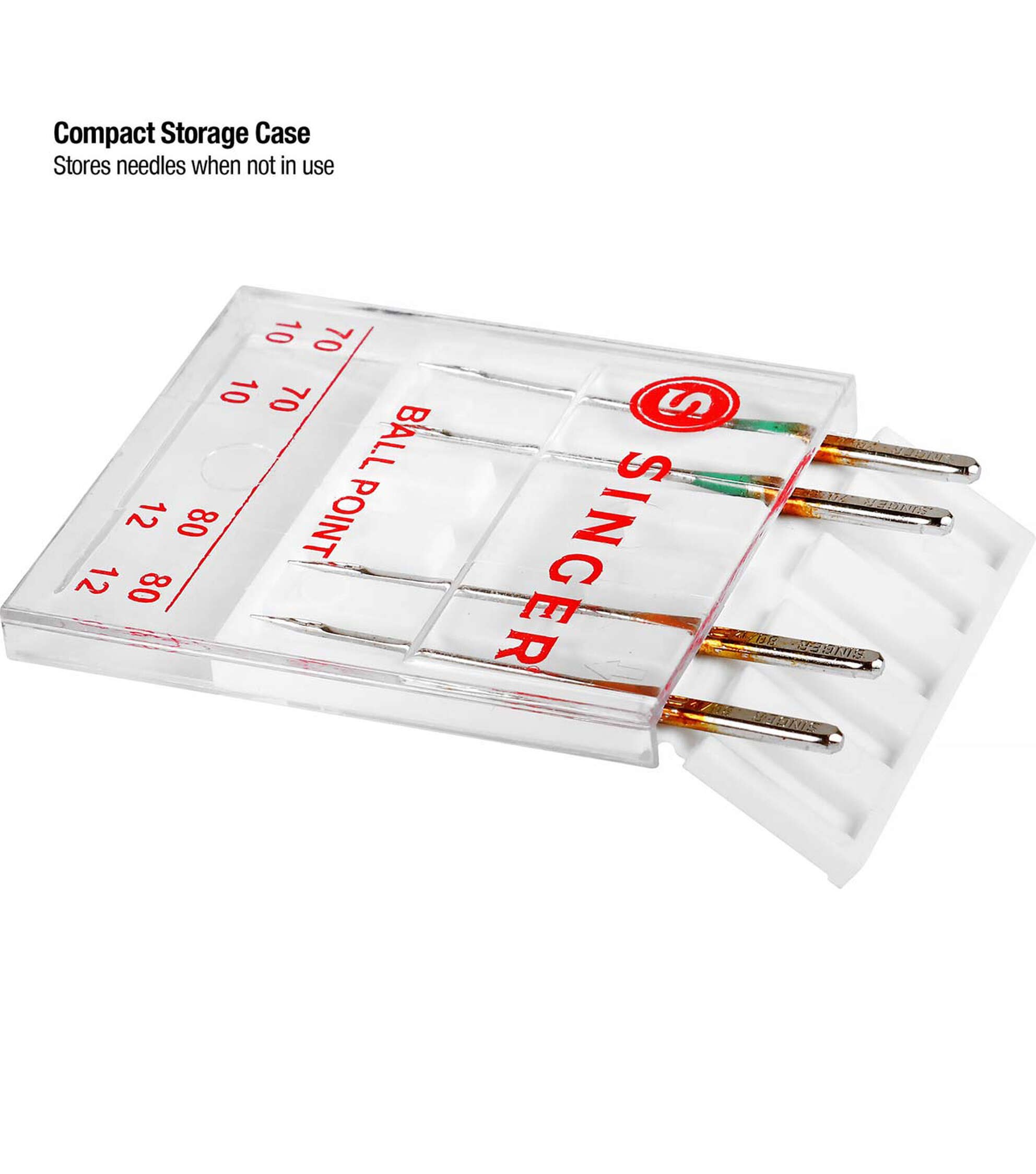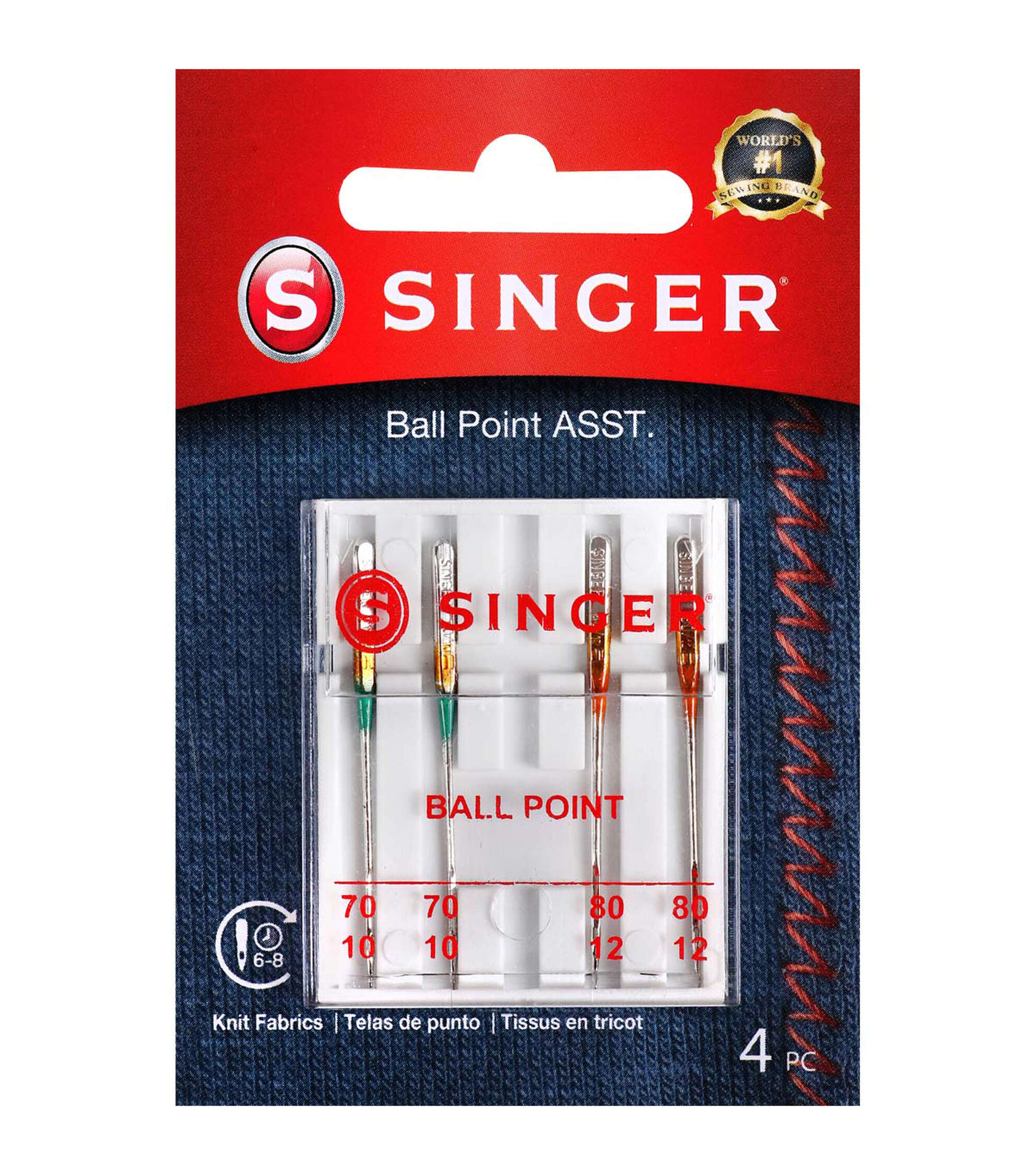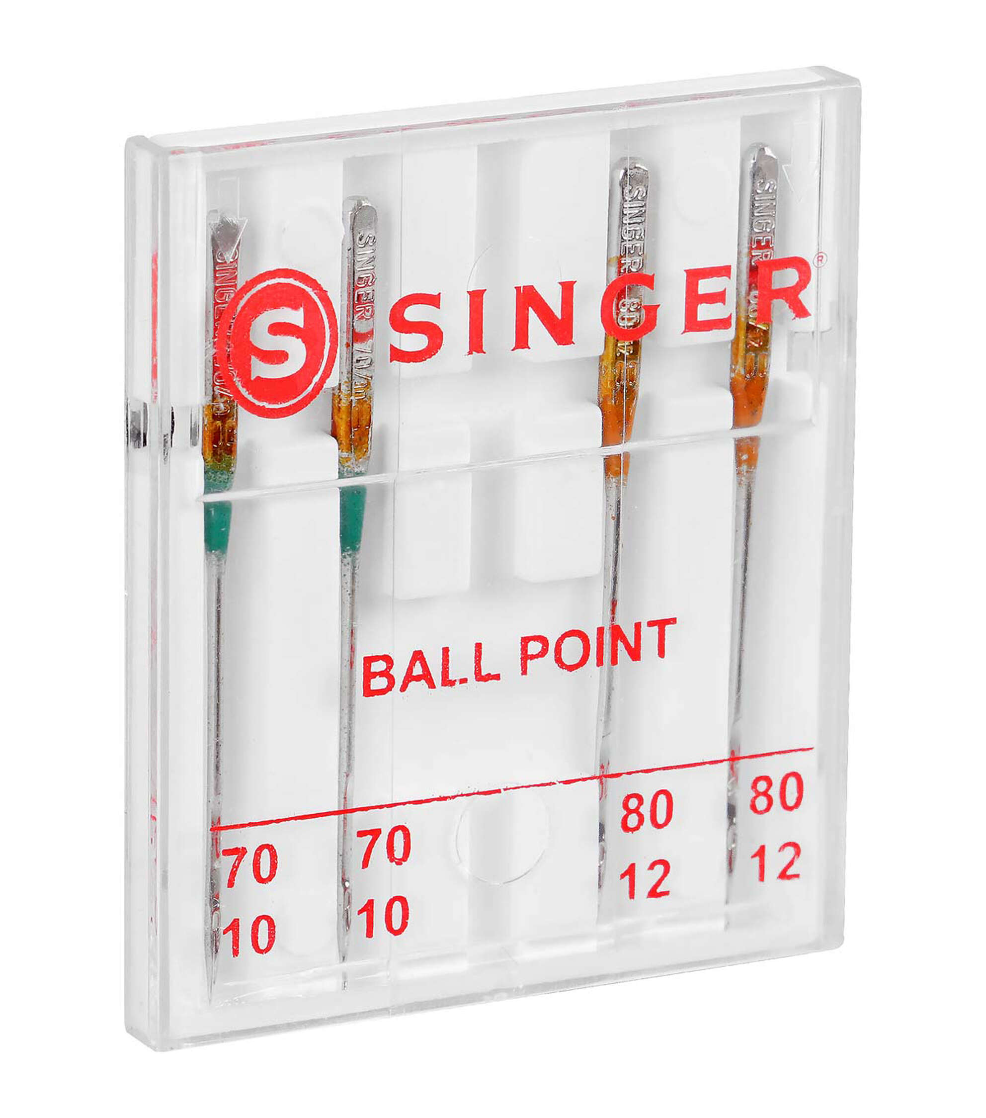 Perform multiple standard stitching projects on knit fabrics using the Singer Assorted Universal Ball Point Machine Needles. Ball point needles are best used on knit fabrics. This pack includes four machine needles that come color coded as per their size. The green-hued needles in size 70/09 and orange-colored needles in size 80/11 are designed for use on lightweight fabrics. All the needles come in an easy-to-store plastic container with sizes marked on the cover for easy location and replacement. These needles are compatible with Singer, Brother, Kenmore and other quality sewing machines.