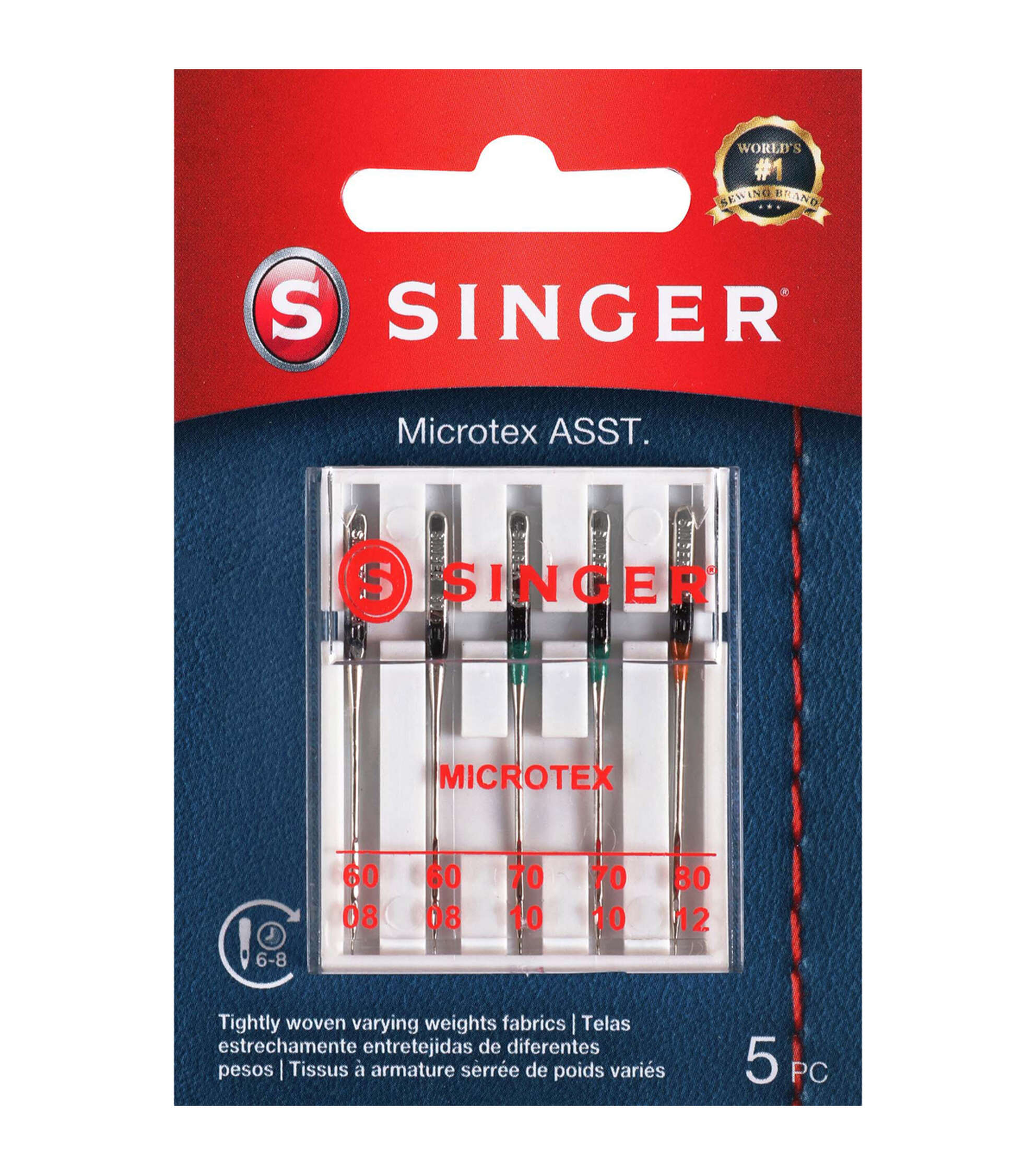 Get perfectly straight stiches in your sewing projects with the Singer Assorted Universal Microtex Sewing Machine Needles. This set of five multi-sized machine needles are designed with thin, sharp points. These needles come in three sizes of 70/09 that can be used on sheer, lightweight fabrics, 60/08 that are ideal to be used on lightweight fabrics and 80/11 that are perfect to be used on silk and other lightweight woven fabrics. They can be used with Singer, Brother, Kenmore and other quality sewing machines. The needles come in a thin, durable case with needle sizing marked on the clear cover.