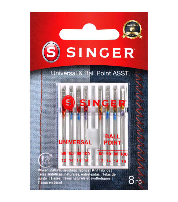 The Singer Universal Regular & Ball Point Sewing Machine Needles is a great starter kit for beginner sewing enthusiasts. This kit contains regular point and ball point machine needles, with four each in assorted sizes. These needles are color codes for easy identification. You can use the orange-hued size 80/11 needles on lightweight fabrics, the blue-colored size 90/14 needles on medium-weight fabrics and the purple-shaded size 100/16 needles on heavyweight fabrics. They work best on quality sewing machines including Singer, Brother, Kenmore and more.