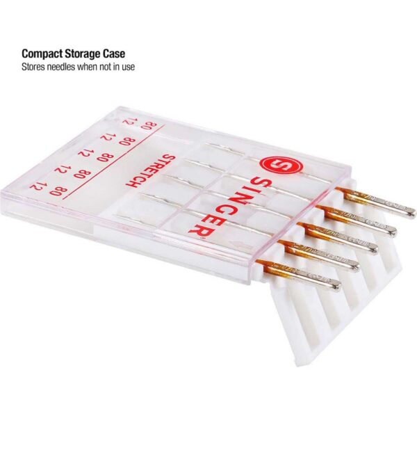 The Singer Universal Stretch Sewing Machine Needles are designed to prevent skipped stitches when working on spandex, lycra and suedes. This pack contains five size 80/11 needles that are best used on lightweight, stretch fabrics. They come in a compact case with sizing marked on the cover.