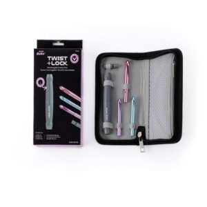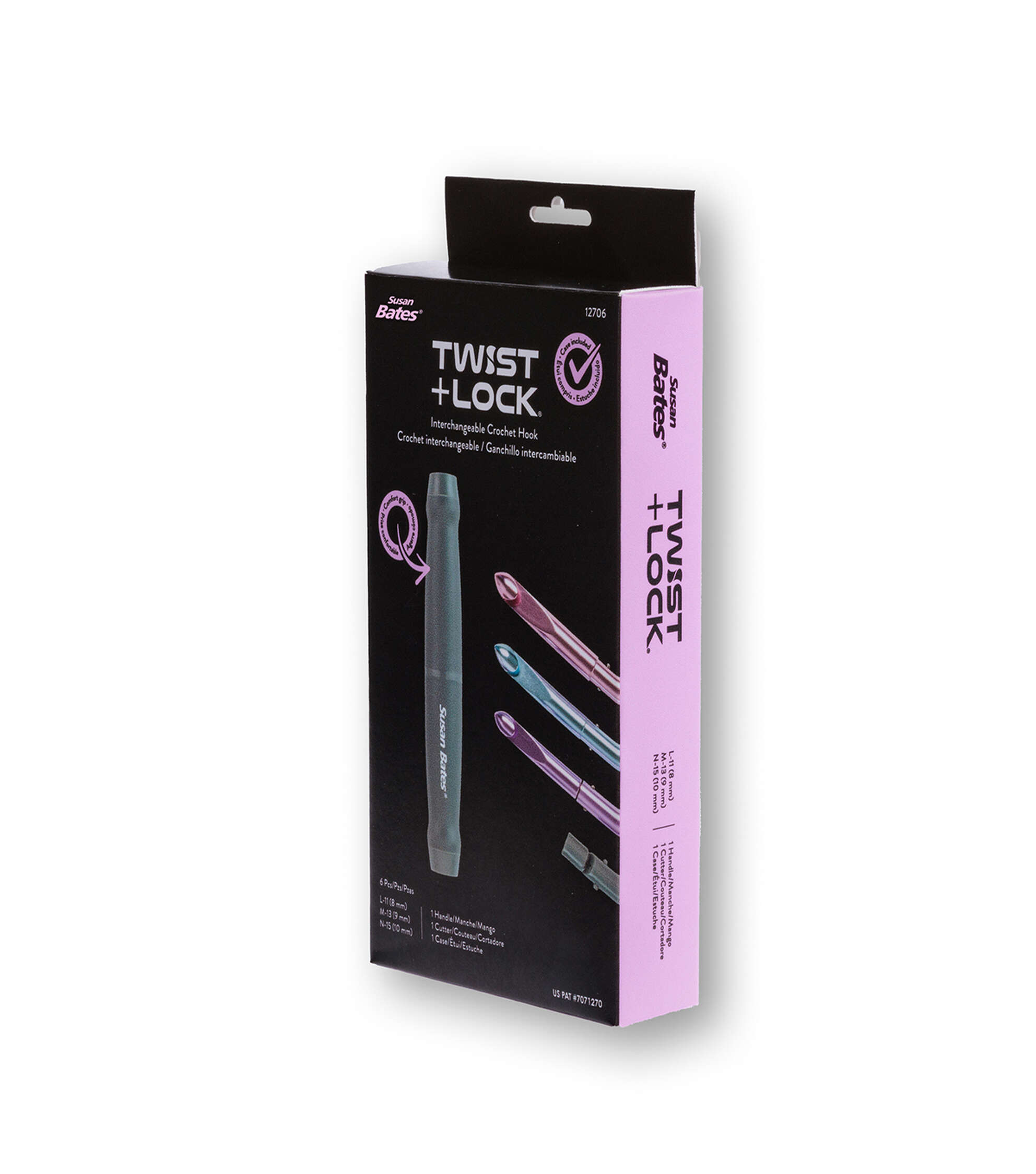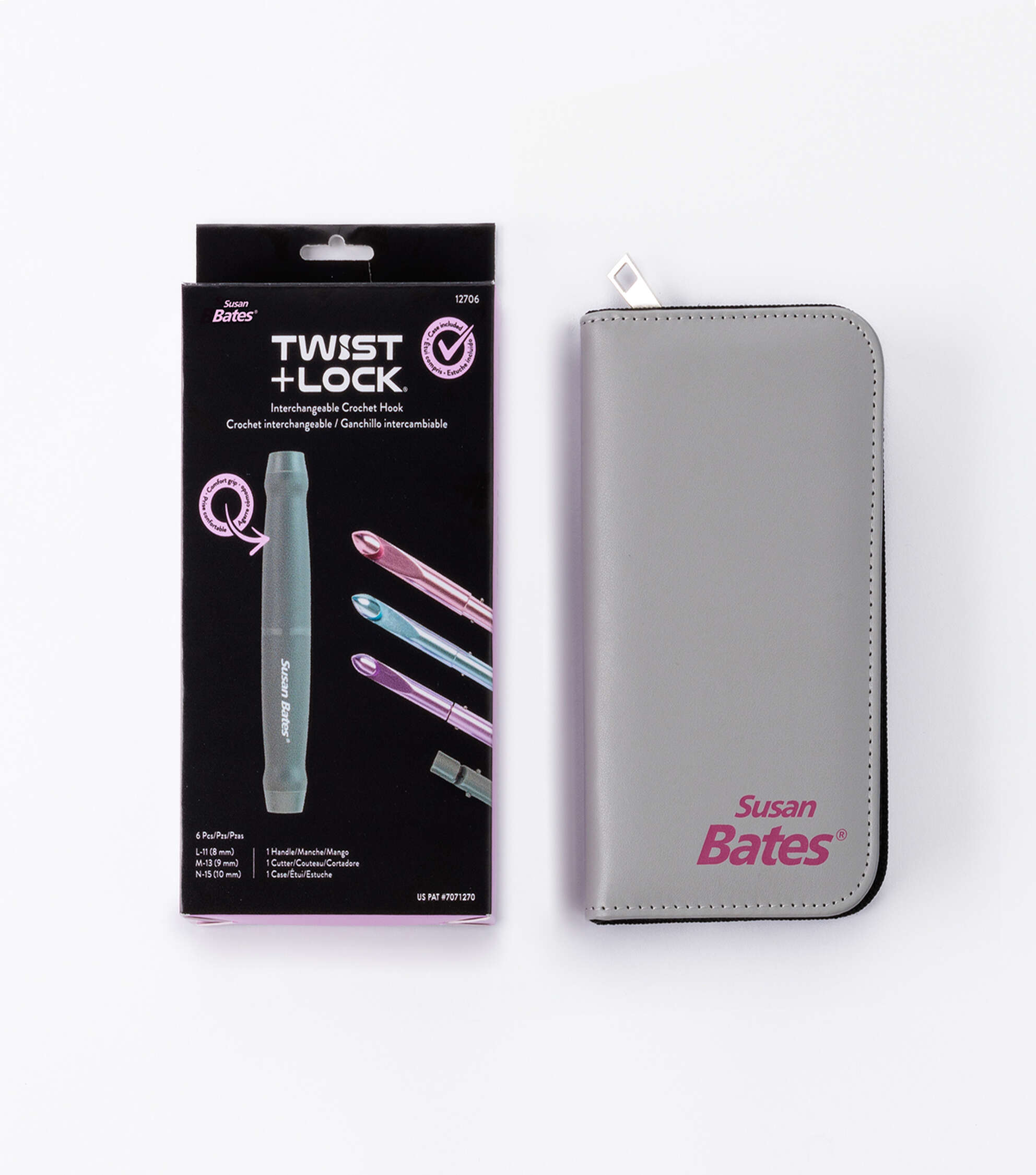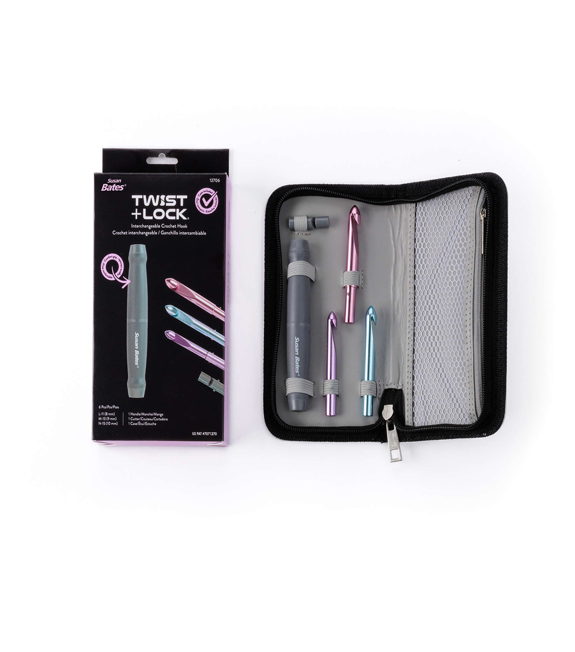 Crocheting just became easier with the new Susan Bates Twist + Lock Interchangeable Crochet Hook set, now comes in a travel friendly zippered case for easy storage! Select the desired hook size and insert into the opening of the oversized soft and ergonomic handle. With a simple Twist and Lock, your crochet hook will fit snugly in place whether in action or in storage. The hooks are made with lightweight aluminum and have velvetly smooth finish. With the hook on one side, and yarn cutter on the other- customize it however you like!