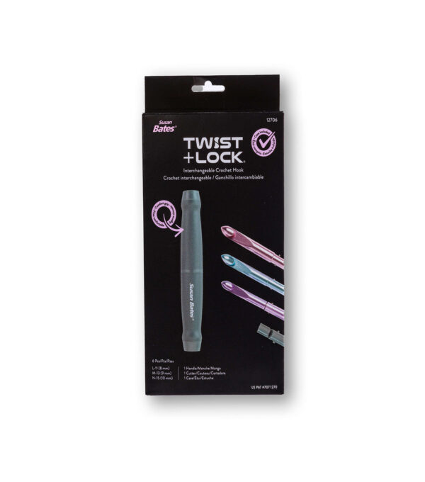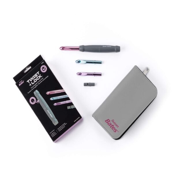 Crocheting just became easier with the new Susan Bates Twist + Lock Interchangeable Crochet Hook set, now comes in a travel friendly zippered case for easy storage! Select the desired hook size and insert into the opening of the oversized soft and ergonomic handle. With a simple Twist and Lock, your crochet hook will fit snugly in place whether in action or in storage. The hooks are made with lightweight aluminum and have velvetly smooth finish. With the hook on one side, and yarn cutter on the other- customize it however you like!
