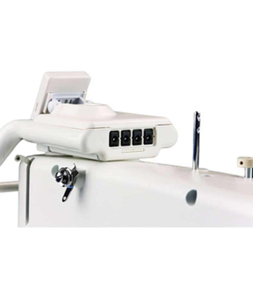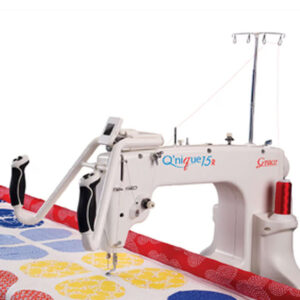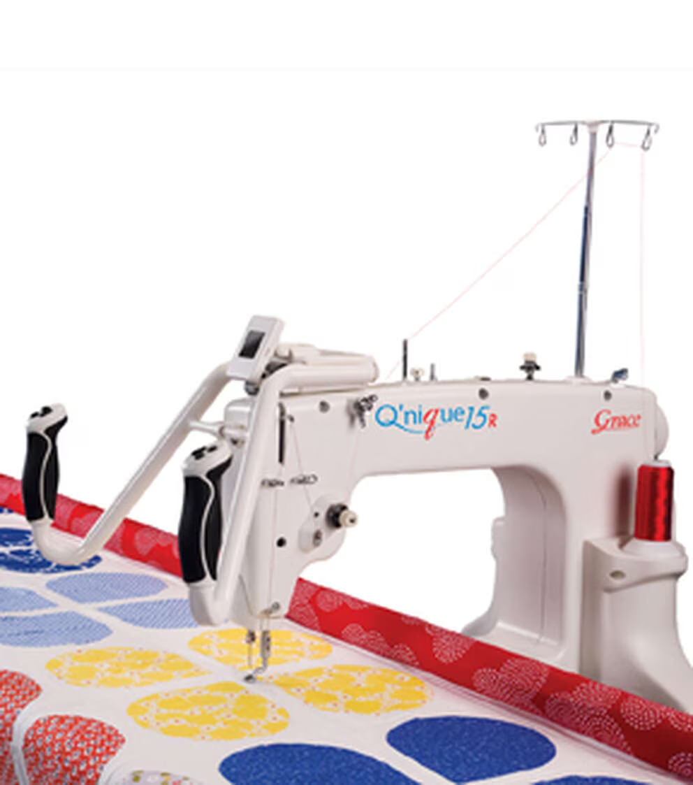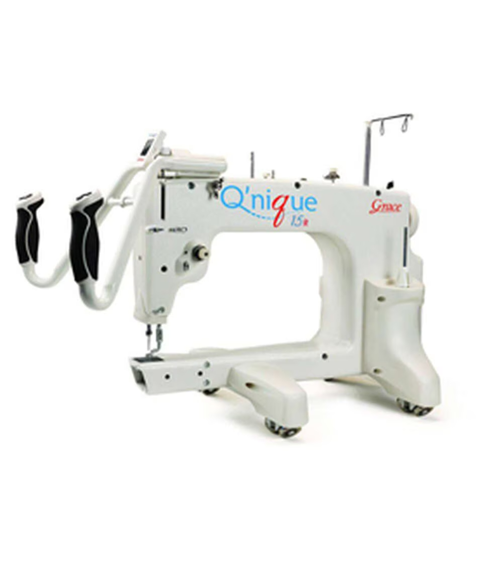 Get all the high-end quilting features packed into The Grace Company Q’nique 15R Mid-arm Quilting Machine & Frame. This quilting machine and frame offers superior stitching quality. The stitch regulation keeps your beautiful stitches consistently the same length. As you speed up or slow down in your movements, the machine will speed up and slow down its stitching speed. You don’t have to worry about some stitches being longer or shorter than others. This machine features six quick-access handle buttons, a full-color OLED screen, built-in bobbin winder, an easy-access bobbin and a large M-class bobbin. The Q-Zone Queen Frame sets up in queen or crib size. It is a no-baste two-rail system designed to make your quilting projects easier and more convenient. The frame features a smooth gliding track system for easy and precise machine movements. It also has height-adjustable legs, and includes quilt clips for easy fabric loading and tension control. New quilters are delighted to find how much easier quilting is with this quilting frame. Moving the machine to stitch is like drawing with a pencil on paper, not moving the paper underneath a stationary pencil.