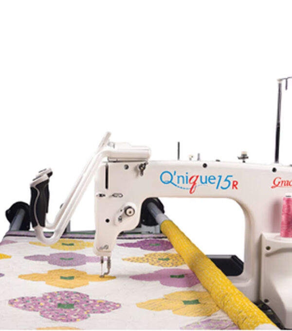 Get all the high-end quilting features packed into The Grace Company Q’nique 15R Mid-arm Quilting Machine & Frame. This quilting machine and frame offers superior stitching quality. The stitch regulation keeps your beautiful stitches consistently the same length. As you speed up or slow down in your movements, the machine will speed up and slow down its stitching speed. You don’t have to worry about some stitches being longer or shorter than others. This machine features six quick-access handle buttons, a full-color OLED screen, built-in bobbin winder, an easy-access bobbin and a large M-class bobbin. The Q-Zone Queen Frame sets up in queen or crib size. It is a no-baste two-rail system designed to make your quilting projects easier and more convenient. The frame features a smooth gliding track system for easy and precise machine movements. It also has height-adjustable legs, and includes quilt clips for easy fabric loading and tension control. New quilters are delighted to find how much easier quilting is with this quilting frame. Moving the machine to stitch is like drawing with a pencil on paper, not moving the paper underneath a stationary pencil.