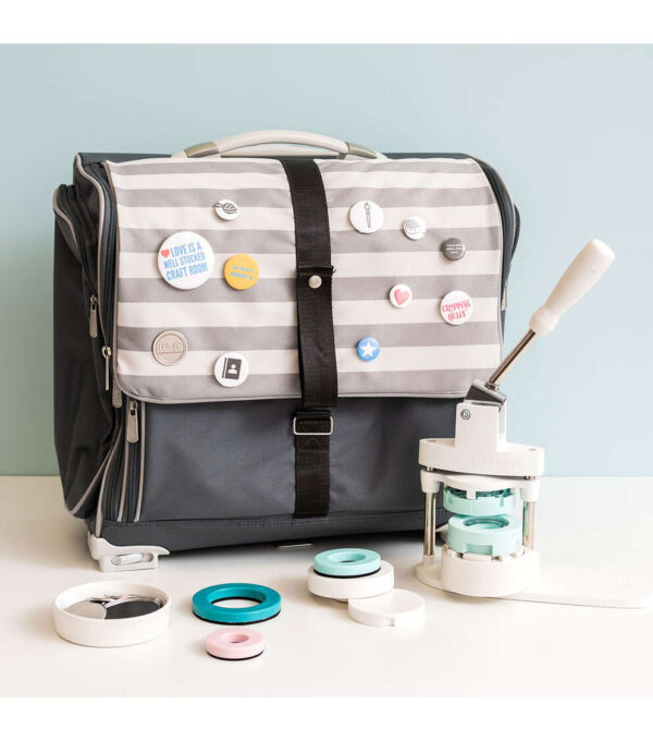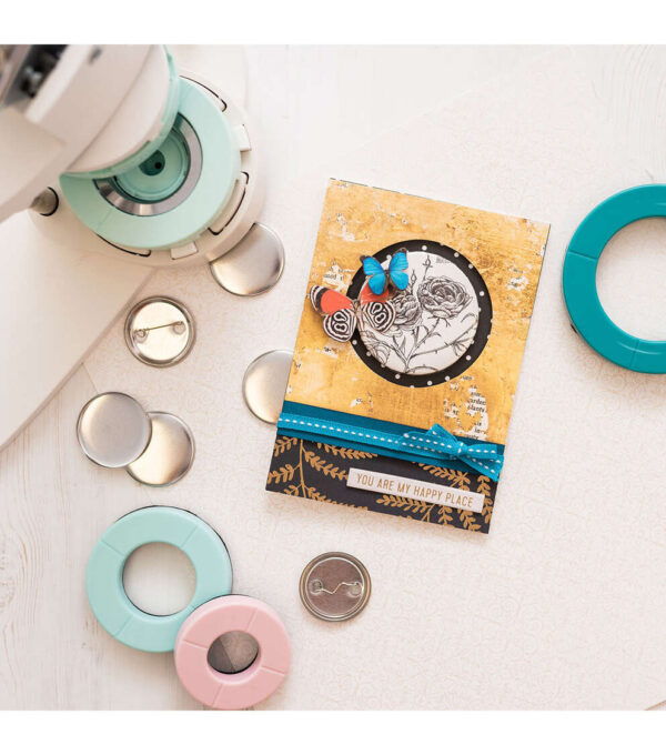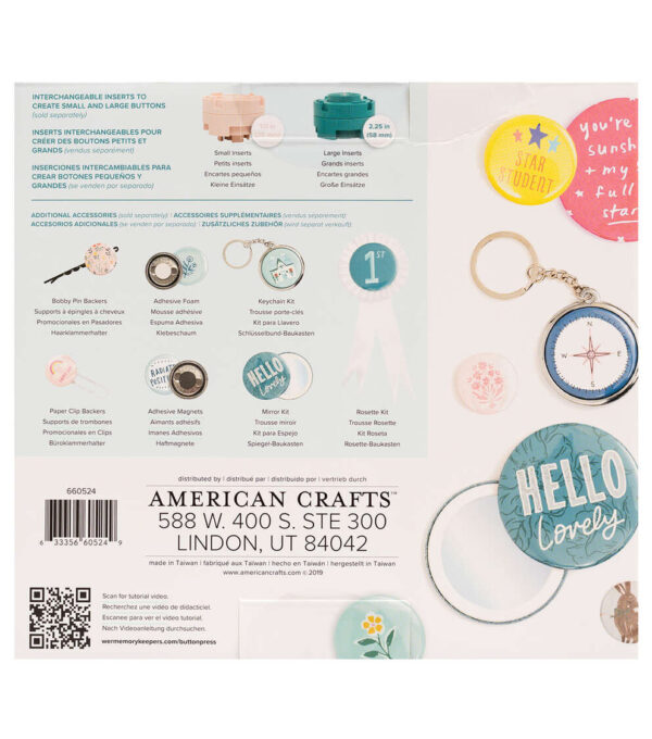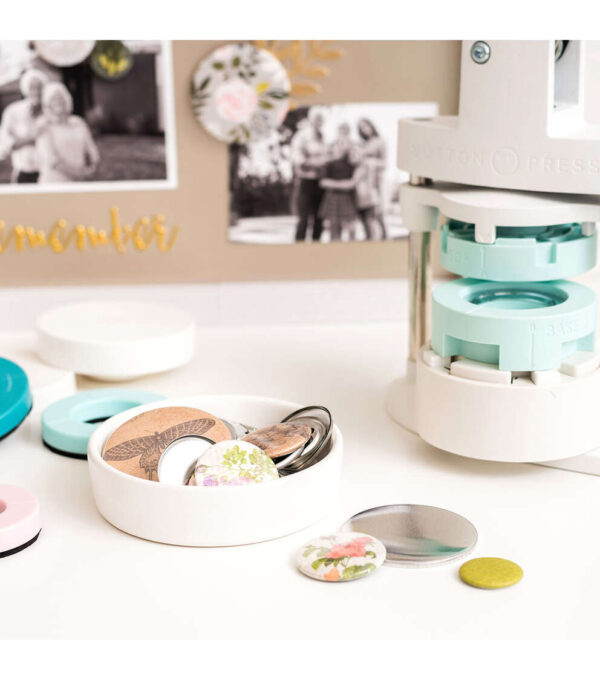 Easily create buttons, magnets, keychains, and so much more with the Button Press by We R Memory Keepers! This unique press cuts your favorite papers to the correct size for both small and large projects. The Button Press features an easy-to-press handle, and can be used to create buttons out of paper, cardstock, and fabric. This package includes one Button Press, a medium top and base insert, a medium die, top and base die platform, metal shells, mylar, and pin packs (enough supplies to make 5 buttons).