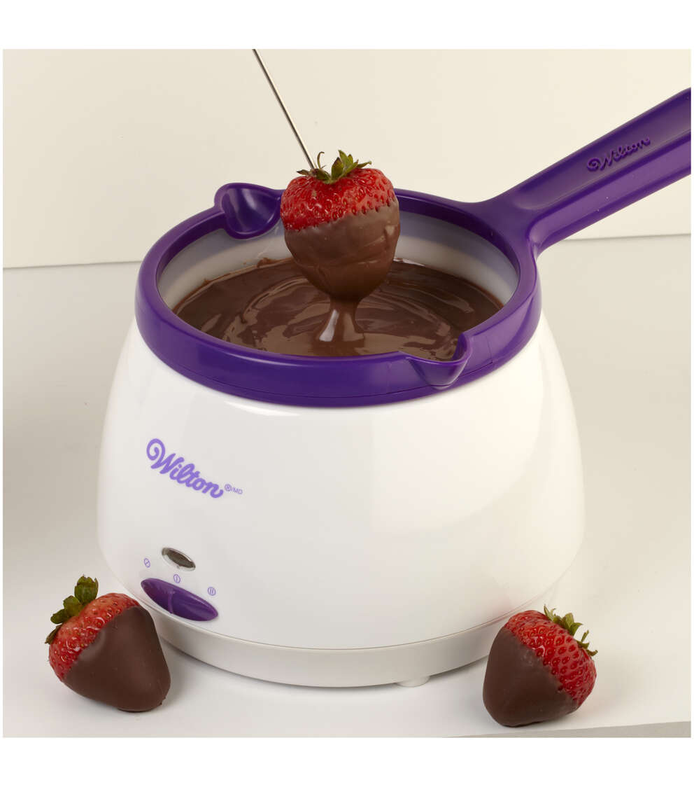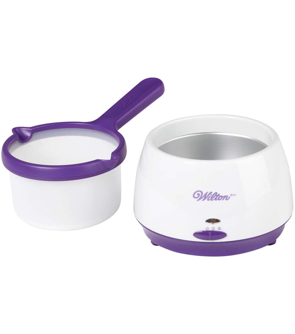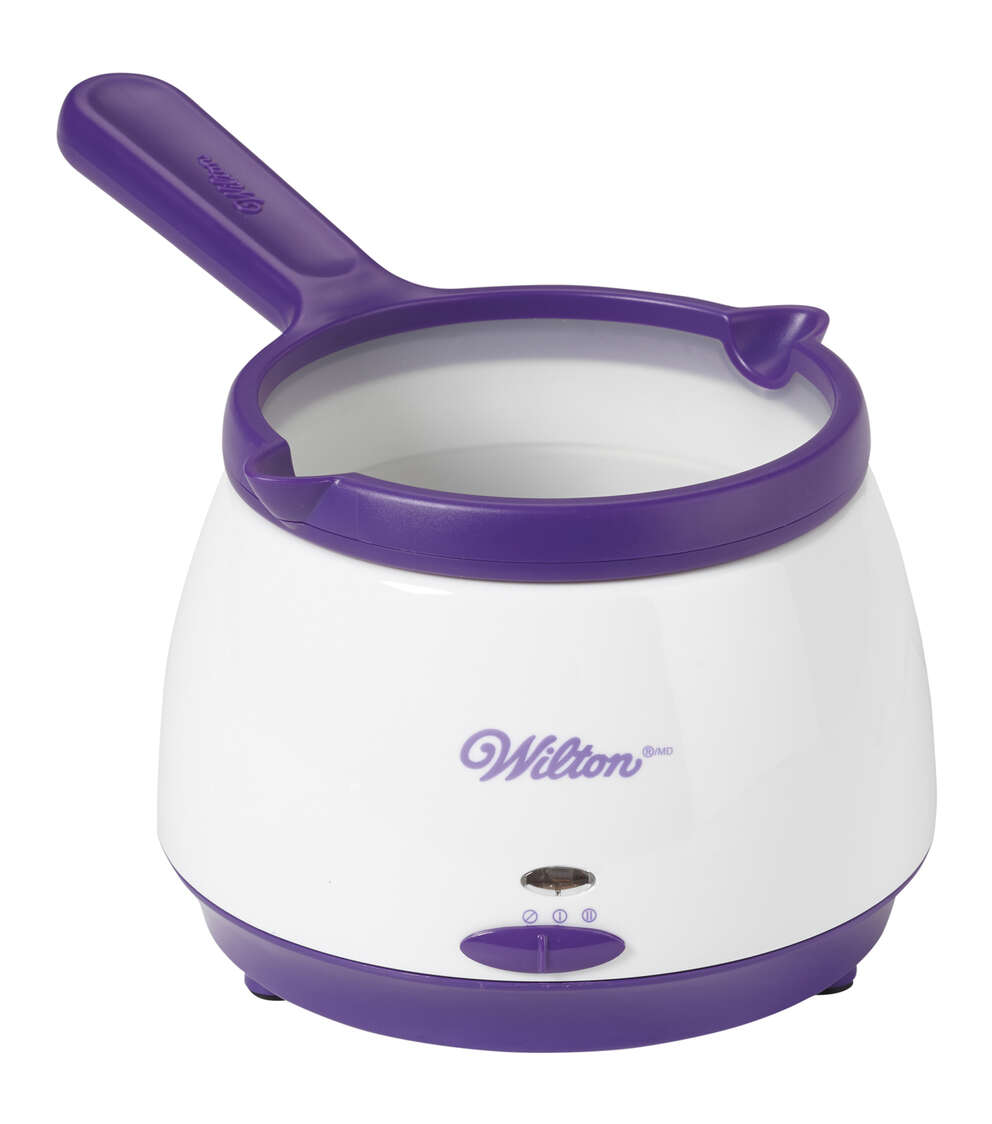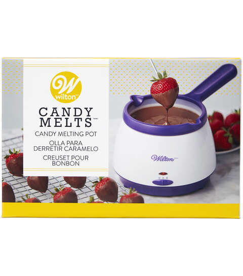 Wilton-Candy Melts Melting Pot. Dip, coat and drizzle! Melts up to 2-1/2 cups of Candy Melts candy (sold separately) in ten minutes or less! Has a silicone liner pot for even heating and easy clean-up, dual side pour spouts and a white body with purple accents. Non- skid feet keep the melting pot steady on the counter. This 8- 1/2×10-1/2×6-1/4 inch package contains one candy melting pot with two temperature settings, a safety light and a standard 120 volt cord with polarized plug. Imported.