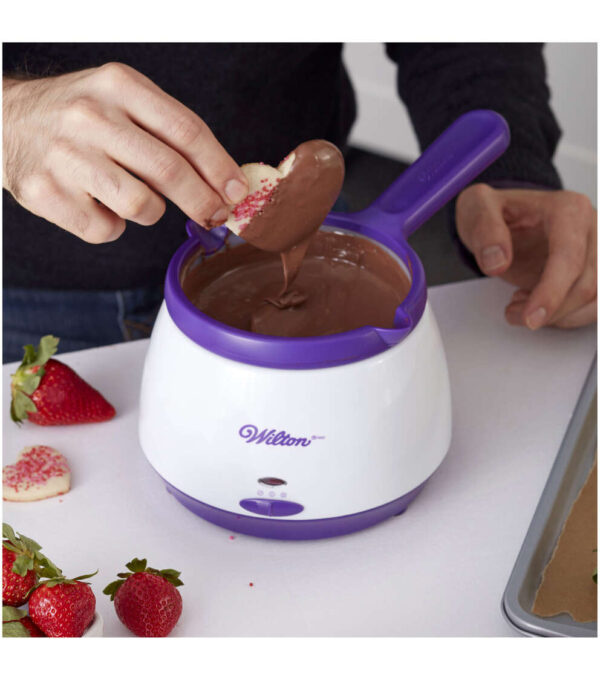 Wilton-Candy Melts Melting Pot. Dip, coat and drizzle! Melts up to 2-1/2 cups of Candy Melts candy (sold separately) in ten minutes or less! Has a silicone liner pot for even heating and easy clean-up, dual side pour spouts and a white body with purple accents. Non- skid feet keep the melting pot steady on the counter. This 8- 1/2×10-1/2×6-1/4 inch package contains one candy melting pot with two temperature settings, a safety light and a standard 120 volt cord with polarized plug. Imported.
