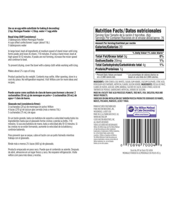 Primary ingredient for royal icing. Adds body to royal icing, meringue, boiled icing; stabilizes buttercream. Replaces egg white in many recipes. Resealable top opens completely for easy measuring. Certified Kosher.